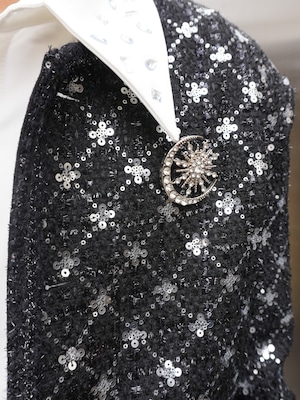 【ALUDE SELECT】argyle sequins tweed jacketは、「綺麗め」を極めつつ、圧倒的な個性を宿した唯一無二の一着。上品なツイードの全面に菱形のスパンコールを散りばめ、動くたびに贅沢な光沢を放ちます。胸元の幻想的な三日月のブローチと、肩パッドによる凛としたシルエットが、他にはない気品と存在感を演出。日常の装いにプラスするだけで、周囲と一線を画す高級感のあるコーデが完成します。定番では物足りない方へおすすめな、美しく華やかなデザインの一着です。